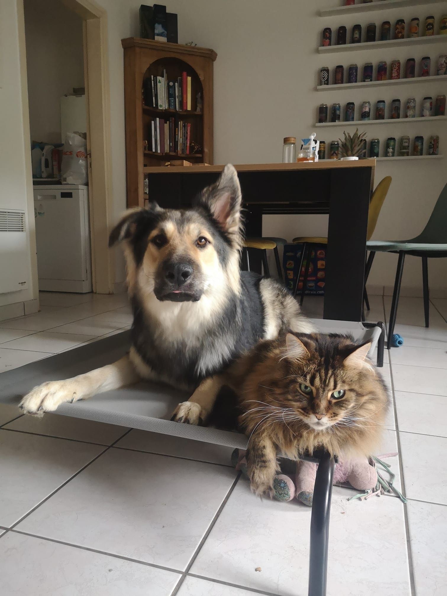 Arrivée chez nous, sa cohabitation avec nos chats a été un peu compliquée et longue à mettre en place à cause de son dynamisme débordant et son côté bourrin. Désormais elle fait ses siestes tranquillement à côté des félins.